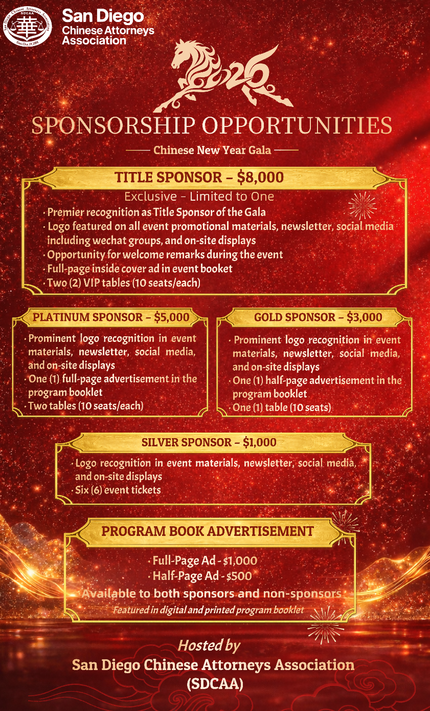 Sponsorship provides a meaningful opportunity to support diversity and cultural heritage while increasing visibility within San Diego’s Chinese American legal and professional community.