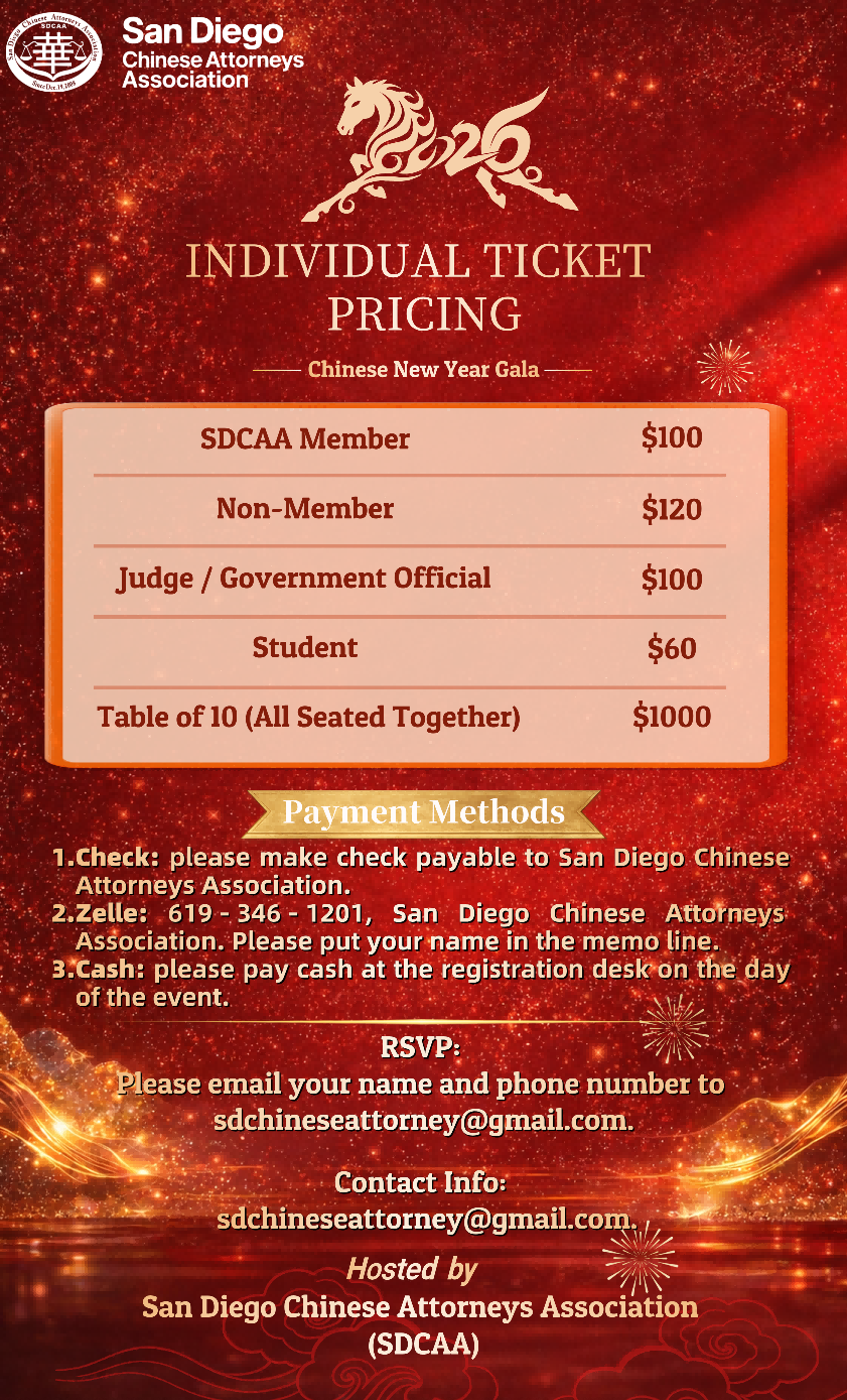 The San Diego Chinese Attorneys Association (SDCAA) is delighted to announce our 2026 Chinese New Year Gala. As we welcome the Year of the Horse, we invite members of the legal and professional community to gather for an evening celebrating culture, connection, and tradition.